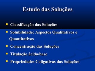 O documento discute conceitos sobre soluções químicas, incluindo classificação de soluções, solubilidade, concentração, titulação ácido-base e propriedades coligativas. Exemplos de cálculos envolvendo estas propriedades são apresentados.