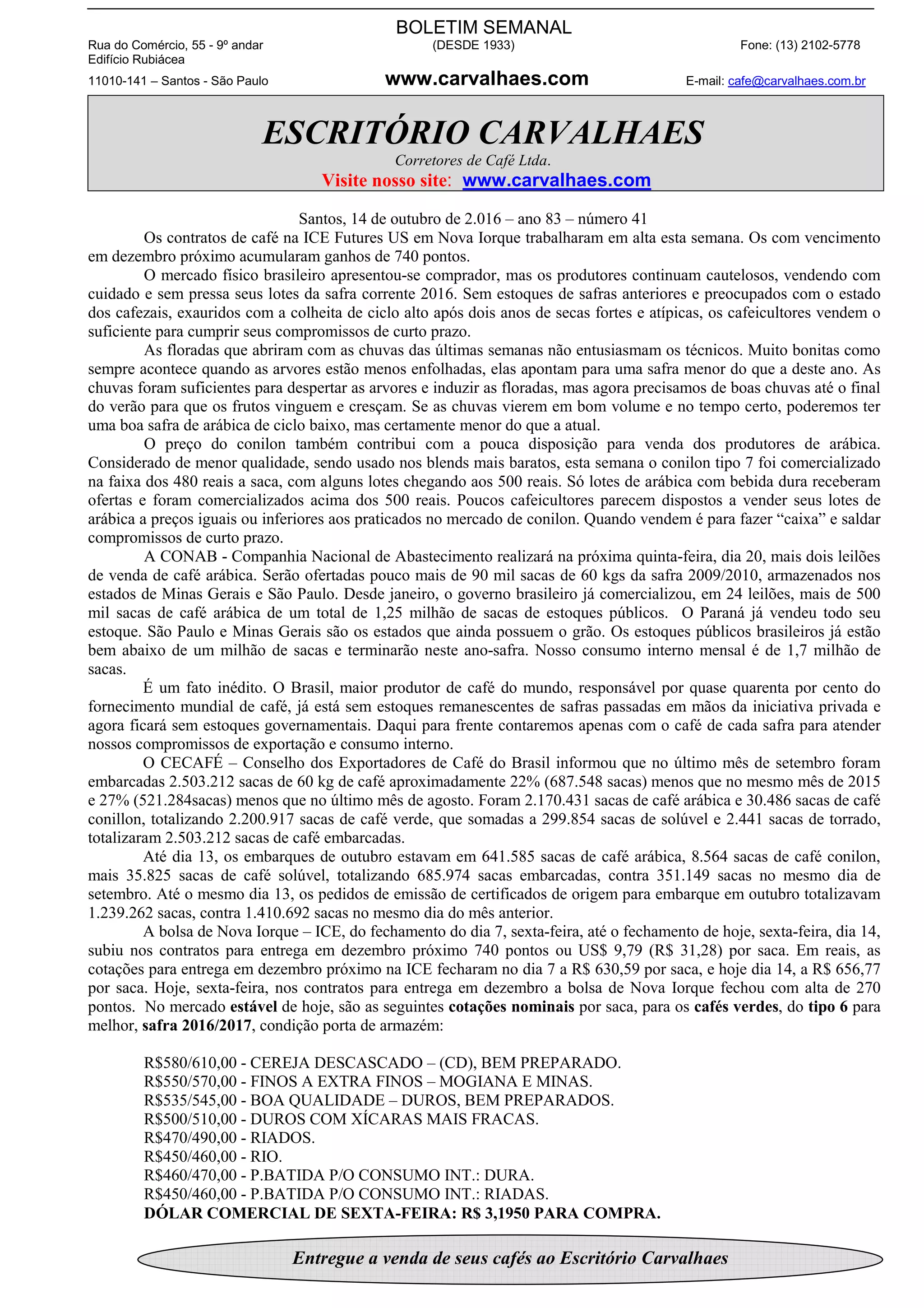 O documento discute a situação do mercado de café no Brasil. Os preços do café estão subindo na bolsa de Nova Iorque e os produtores brasileiros estão vendendo seus estoques com cautela devido à safra menor esperada para o próximo ano. O Brasil está quase sem estoques de safras anteriores em mãos do setor privado e público.