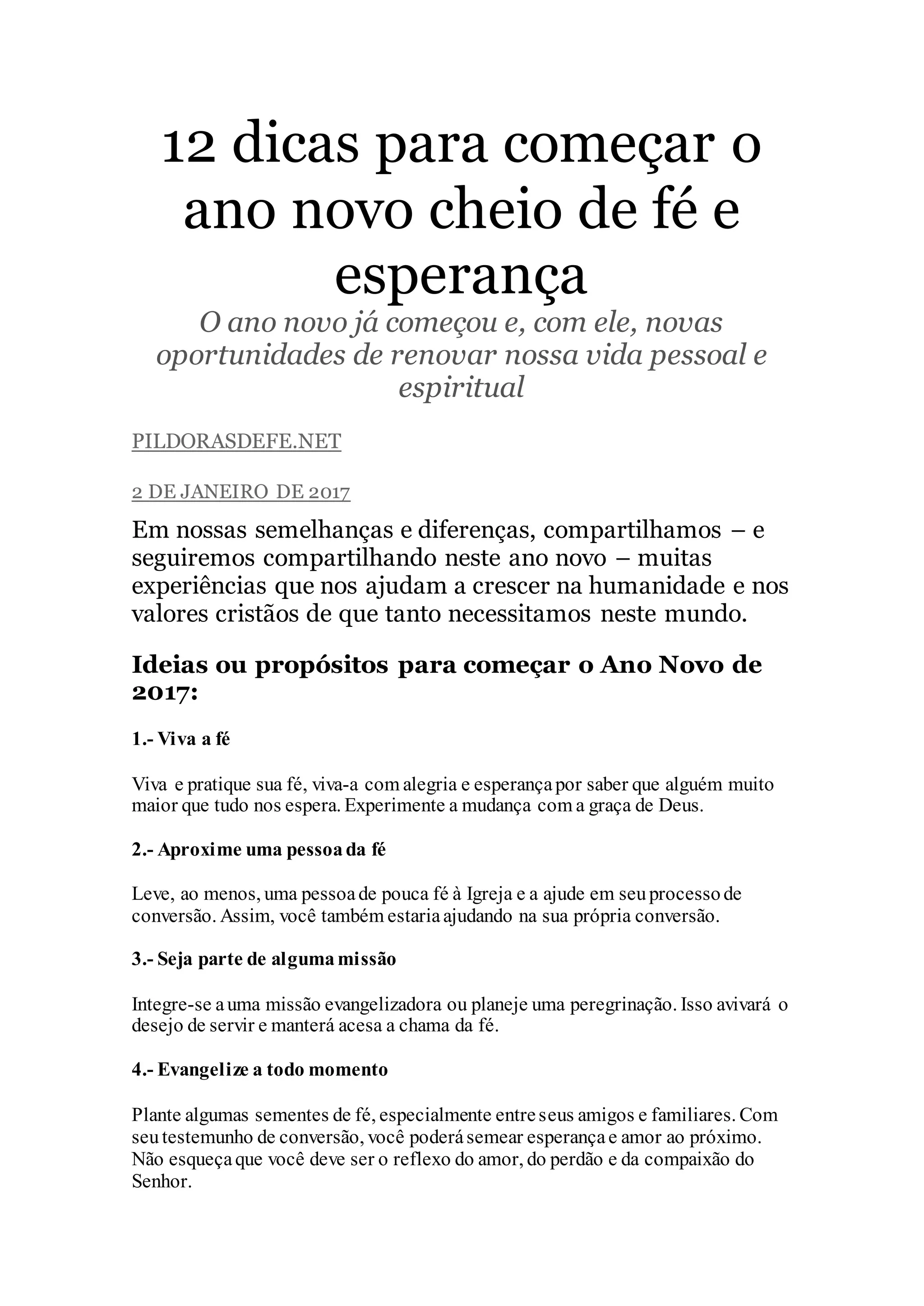 O documento fornece 12 dicas para começar o ano novo com fé e esperança, incluindo viver a fé com alegria, aproximar outras pessoas da fé, se envolver em missões de evangelização, ajudar na paróquia local, praticar obras de caridade e estudar a Bíblia.