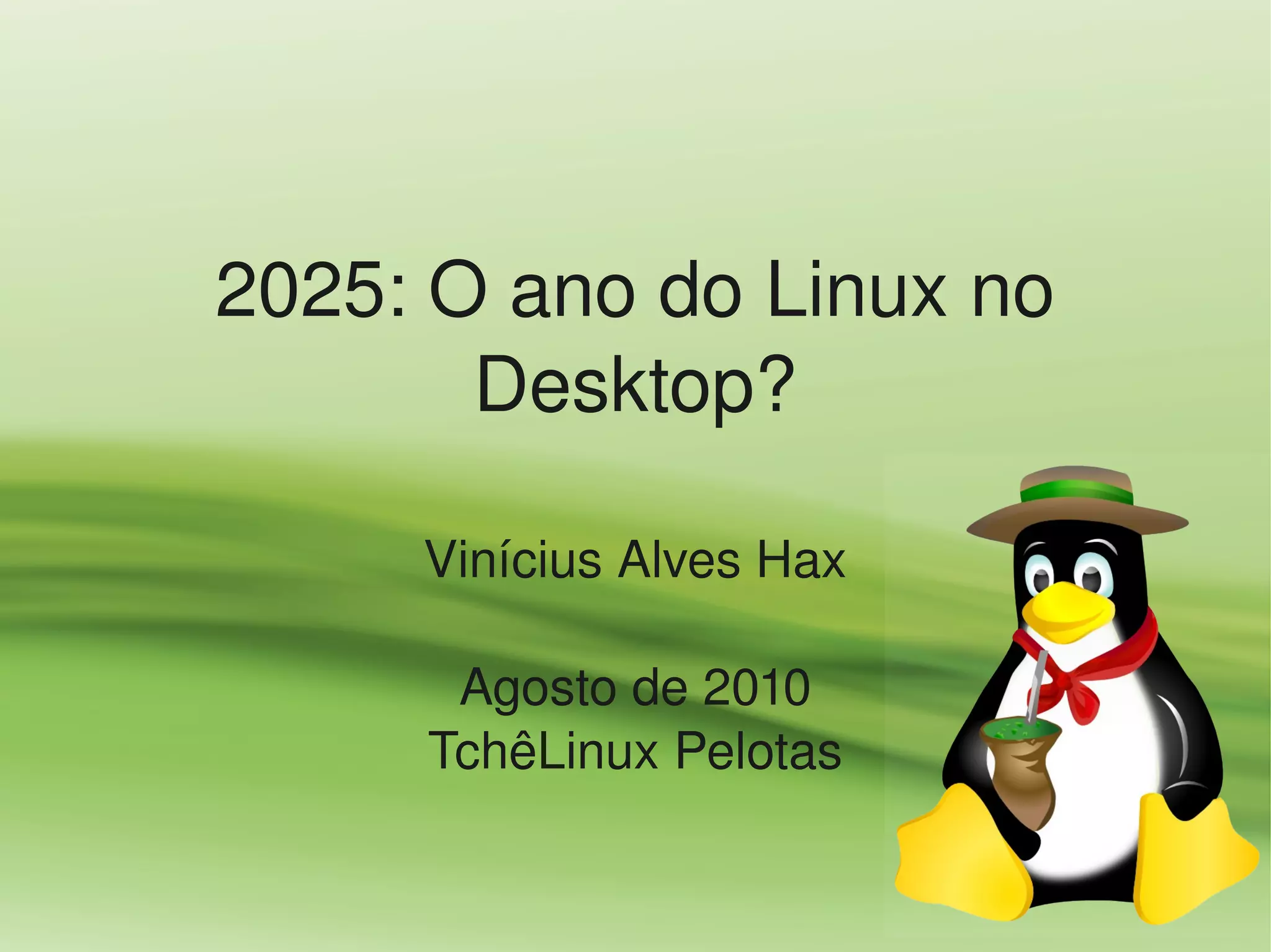 O documento discute o potencial do Linux como sistema operacional de desktop até 2025, apresentando tanto vantagens quanto desvantagens de sua adoção. O autor sugere estratégias para aumentar a participação do Linux no mercado, incluindo a eleição de uma distribuição oficial e campanhas de conscientização. Além disso, destaca a importância da colaboração entre usuários, desenvolvedores e empresas para melhorar a percepção e a usabilidade do Linux no desktop.