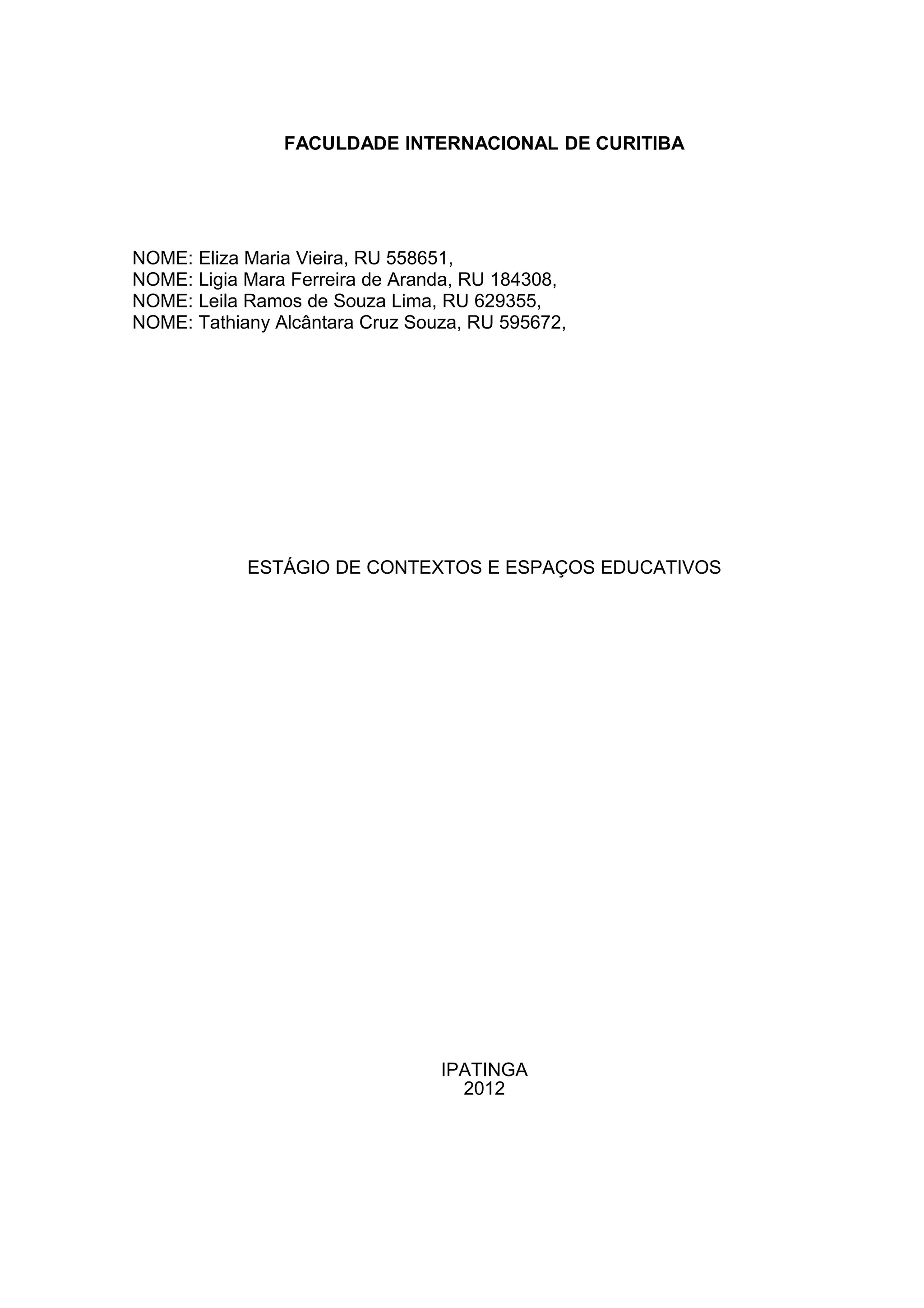 Este documento apresenta o relatório de estágio realizado por quatro estudantes de pedagogia na I.A.C. - Instituto de Ação Comunitária em Ipatinga, MG. O relatório descreve a concepção pedagógica da instituição, as atividades oferecidas e a observação das aulas do "Clubinho da Leitura" pelas estagiárias.