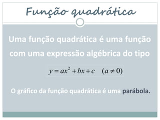 O documento discute funções quadráticas e parábolas. Explica que o gráfico de uma função quadrática é uma parábola e apresenta exemplos de parábolas na natureza, engenharia e arquitetura. Também aborda como resolver equações quadráticas e apresenta exercícios para a prática.