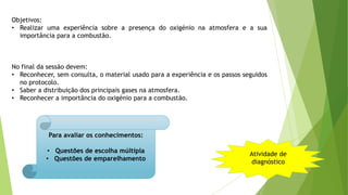 O documento descreve uma experiência sobre a presença de oxigênio na atmosfera e sua importância para a combustão. Os objetivos são reconhecer os materiais usados e os passos do protocolo, saber a distribuição dos principais gases na atmosfera, e reconhecer a importância do oxigênio para a combustão. A avaliação inclui perguntas de múltipla escolha e emparelhamento.