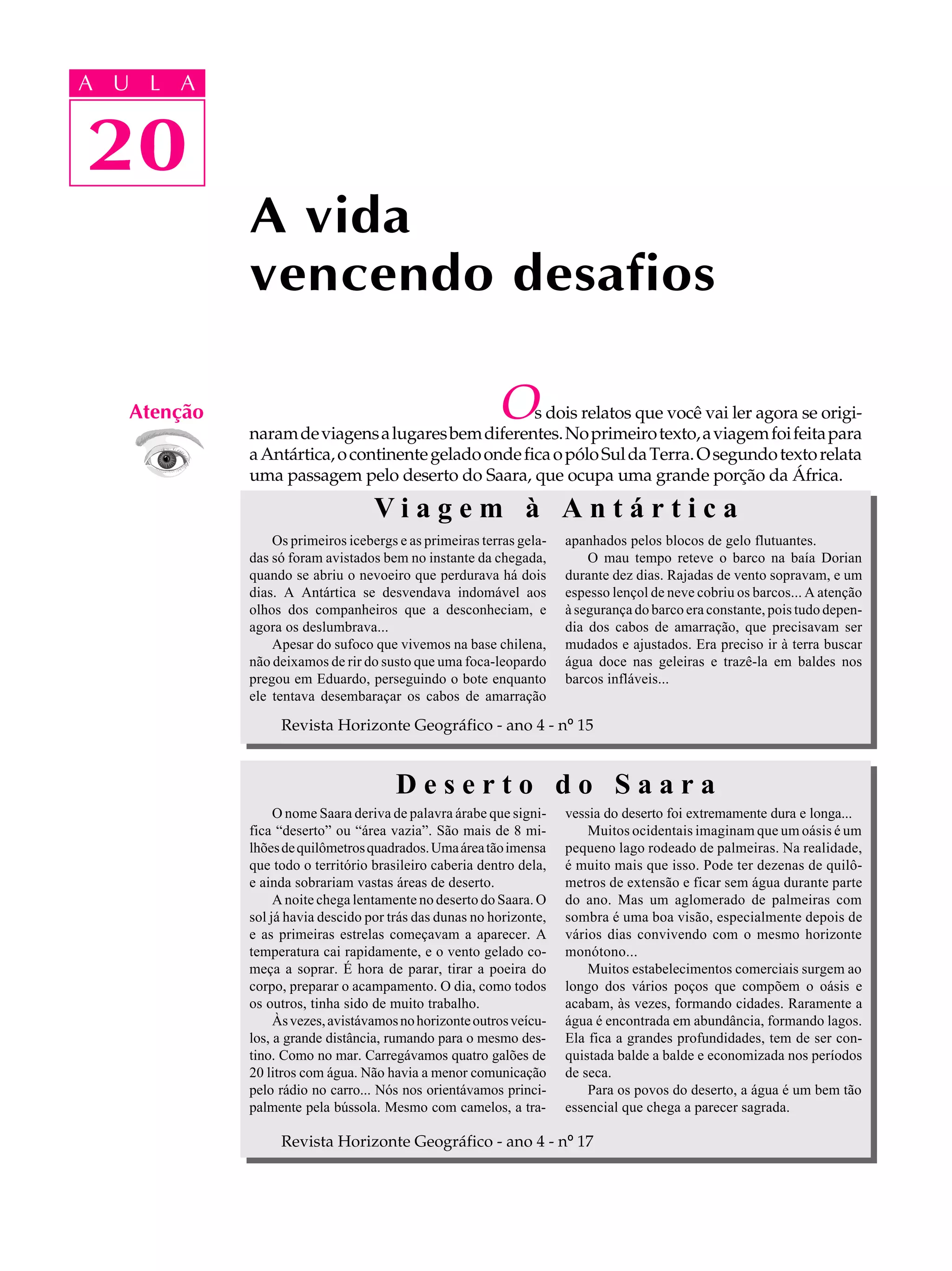Os textos descrevem as condições de vida nos ambientes desérticos e gelados e as adaptações dos seres vivos a esses locais. Ambientes extremamente difíceis onde a sobrevivência depende de adaptações como a ausência de árvores, vegetação apenas no verão, e animais com camadas de gordura, hibernação e migração.