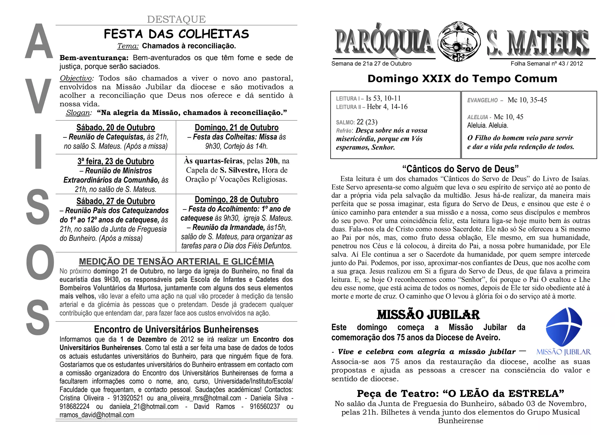 Este documento anuncia as atividades da paróquia de Bunheiro para as próximas semanas, incluindo uma festa das colheitas no domingo com missa e cortejo, reuniões de catequistas e ministros, e medição de tensão arterial e glicemia após a missa do dia 21. Também promove a missão jubilar da diocese de Aveiro e anuncia uma peça de teatro a ser realizada em 3 de novembro.