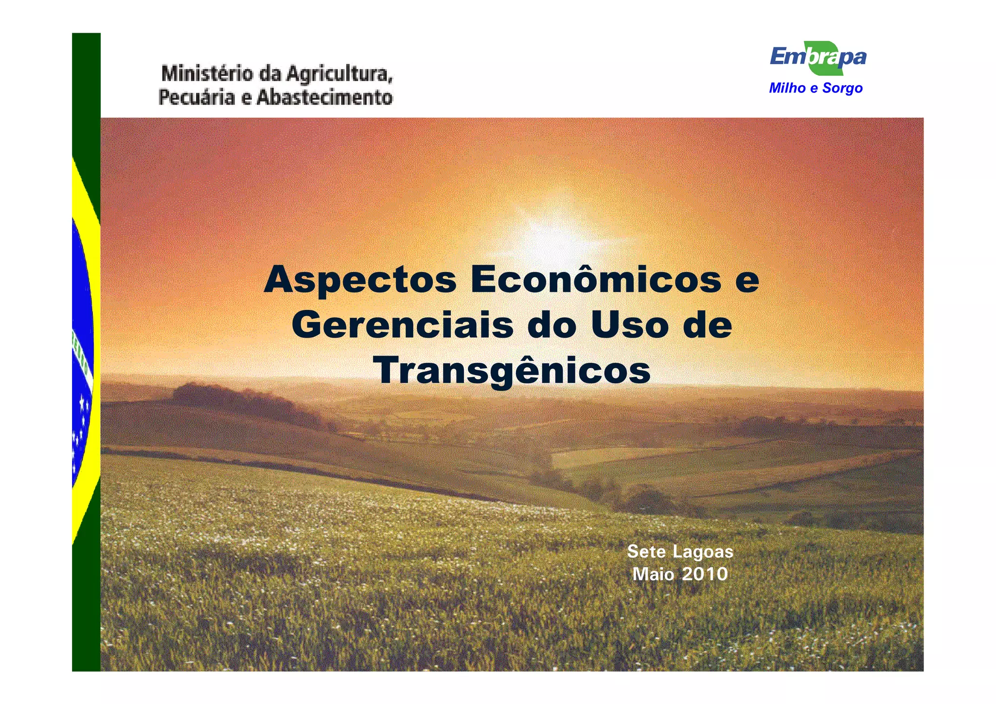 O documento discute a lógica econômica do uso de transgênicos na produção de milho e soja no Brasil. Apresenta como os eventos de tolerância a herbicidas e resistência a pragas podem reduzir custos e aumentar a produtividade ao controlar ervas daninhas e pragas de forma mais eficiente. Também mostra dados sobre a adoção crescente de sementes transgênicas no país e como seus preços tendem a ser maiores que os de sementes convencionais.