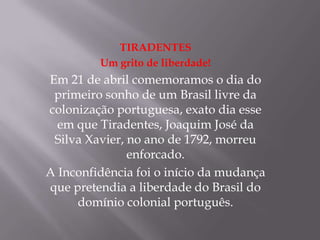 Em 21 de abril comemoramos o dia do primeiro sonho de um Brasil livre da colonização portuguesa, exato dia esse em que Tiradentes, Joaquim José da Silva Xavier, no ano de 1792, morreu enforcado pela Inconfidência, que pretendia a liberdade do Brasil do domínio colonial português. Em 22 de abril de 1500 chegavam ao Brasil 13 caravelas portuguesas lideradas por Pedro Álvares Cabral, marcando a descoberta do Brasil.