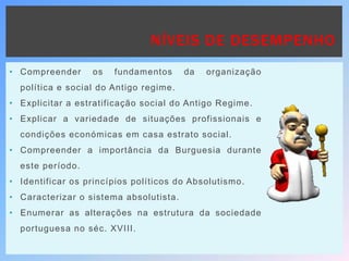 Este documento aborda a estratificação social e o poder político no Antigo Regime. Discute a organização da sociedade em três ordens - clero, nobreza e povo - e os privilégios e deveres de cada grupo. Também explica o sistema absolutista que concentrava todo o poder nas mãos do monarca e como a corte real era usada para controlar a nobreza.