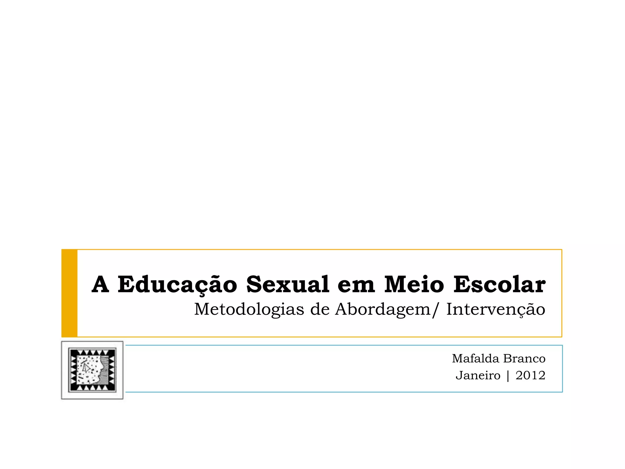 Este documento discute a educação sexual em meio escolar e abordagens metodológicas. Apresenta conceitos de gênero versus sexo, estereótipos de gênero, igualdade de gênero e provérbios. Também lista algumas técnicas para educação sexual como "O que estás a pensar?" e "Tão iguais e tão diferentes" para clarificar opiniões, e "Re-significados" para treinar competências.