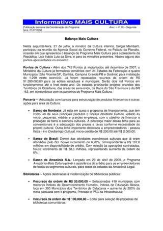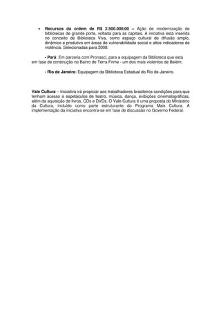 O documento apresenta um balanço do Programa Mais Cultura para o presidente Lula, incluindo a implantação de 1.298 Pontos de Cultura, parcerias com bancos para financiamento de projetos culturais, e ações para modernizar bibliotecas públicas e implementar o Vale Cultura.