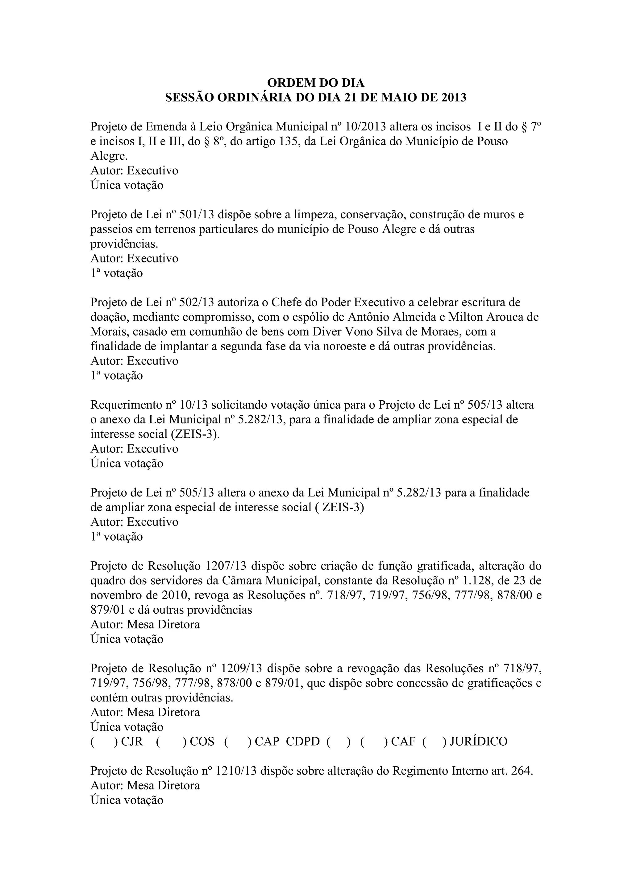 A ordem do dia da sessão ordinária de 21 de maio de 2013 inclui projetos de lei e resoluções sobre alterações à Lei Orgânica do Município de Pouso Alegre, limpeza e construção em terrenos particulares, doação de terras, ampliação de zona especial, criação de cargos na Câmara Municipal, e cessão do plenário para um fórum de saúde.