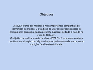 A série de shows "VIVA Elis" promoveu a cultura brasileira e valores da marca NIVEA como tradição, família e feminilidade. A cantora Maria Rita homenageou sua mãe, Elis Regina, cantando suas músicas 30 anos após sua morte. Os shows gratuitos em cinco cidades atraíram mais de 240 mil pessoas e arrecadaram doações para o Retiro dos Artistas.