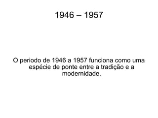 Entre 1946 e 1957, o Brasil assistiu o surgimento do samba-canção e do bolero. Isso marcou a transição entre a tradição e a modernidade na MPB. O samba-canção despontou entre 1952-1957, impulsionado pela popularidade do bolero e pela polêmica entre Dalva de Oliveira e Herivelto Martins. Nesse período, sucessos como "Copacabana", "Dick Farney" e "Segredo" popularizaram os novos estilos musicais.