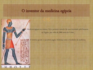 O documento descreve os equipamentos médicos usados no Antigo Egito, incluindo bisturis, agulhas de bronze e pinças cirúrgicas. Também explica que o sacerdote Imhotep é considerado o fundador da medicina egípcia e que a mumificação envolvia a remoção de órgãos para impedir a decomposição dos corpos.