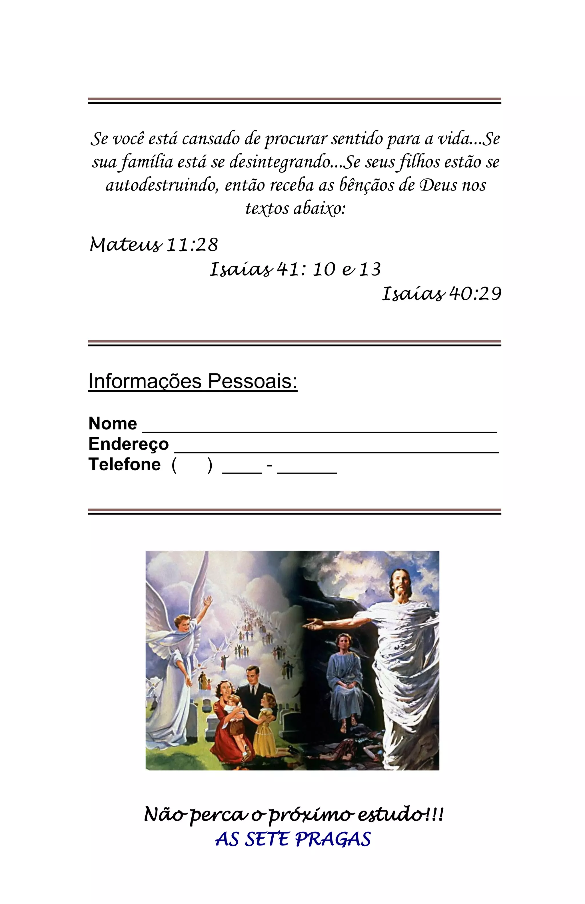 Este documento discute as sete pragas bíblicas e convida as pessoas a abrirem seu coração para Deus antes que a porta da graça seja fechada. Ele resume lições sobre o apocalipse e explica que a porta da graça está aberta desde a morte de Cristo, mas um dia será fechada, após o qual muitos procurarão a Palavra de Deus em vão.