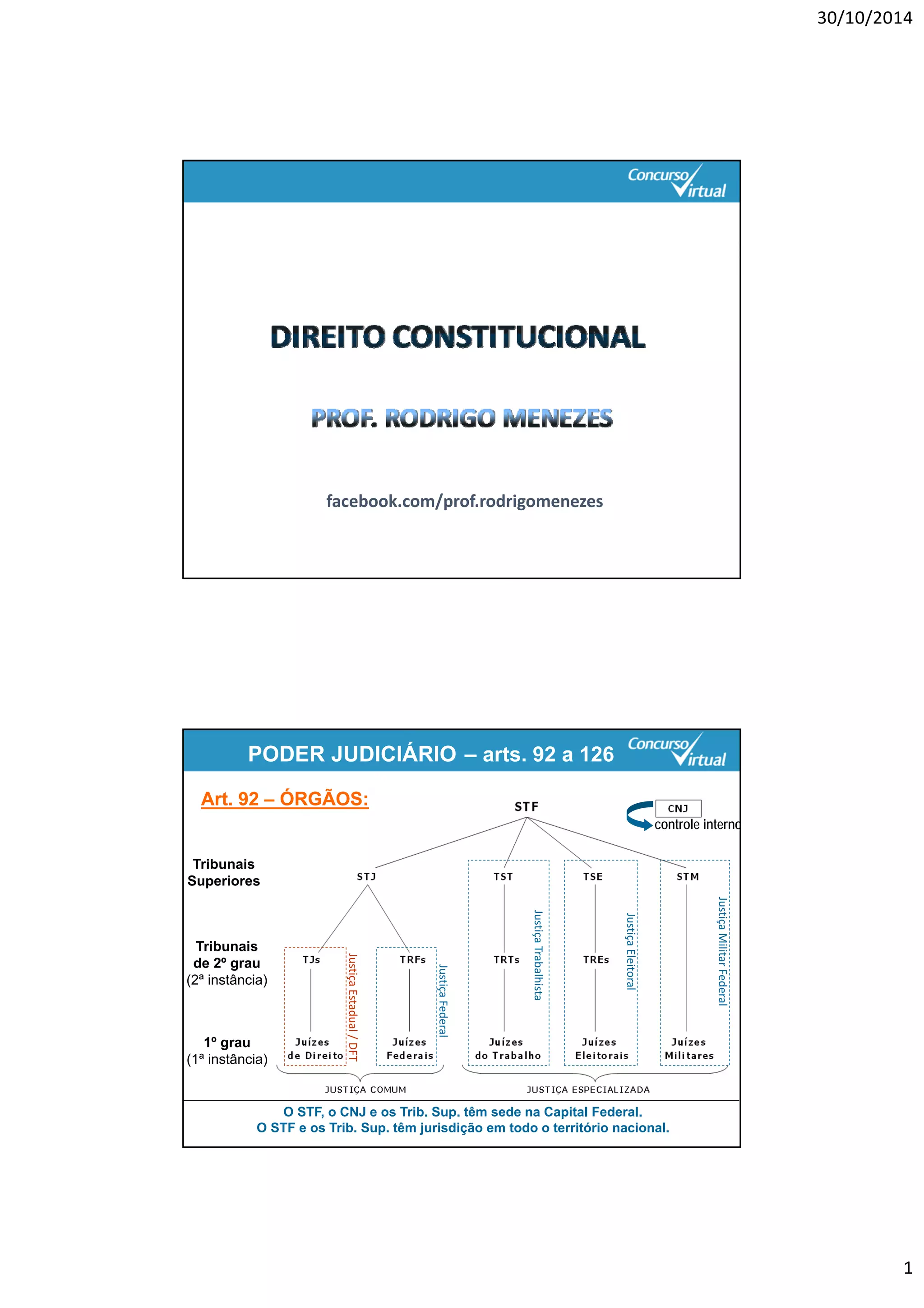 O documento descreve a estrutura do Poder Judiciário brasileiro, mencionando os principais tribunais em diferentes instâncias e esferas, como o STF, STJ, TST e TJs. Também apresenta as garantias dos magistrados, como inamovibilidade, vitaliciedade e vedações como o exercício da advocacia.