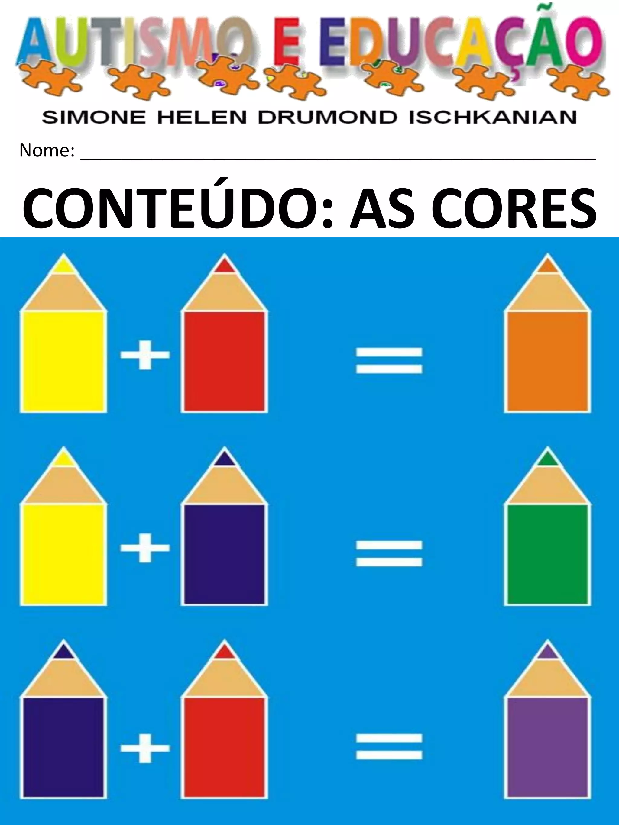 O documento repete várias vezes a pergunta "Qual é a cor?" e a instrução "Ligue - Ligue!", sugerindo que é um material didático sobre cores destinado a crianças pequenas.