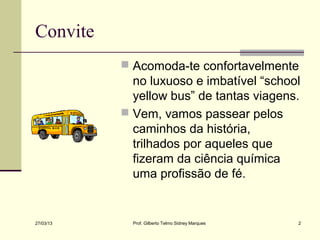 O documento fornece uma introdução sobre a história da química, mencionando o Big Bang e a formação dos primeiros elementos químicos. Também descreve brevemente a formação da Terra e da vida, assim como o desenvolvimento inicial da humanidade e da ciência. Finalmente, apresenta uma lista de tópicos a serem discutidos sobre grandes figuras históricas da química.