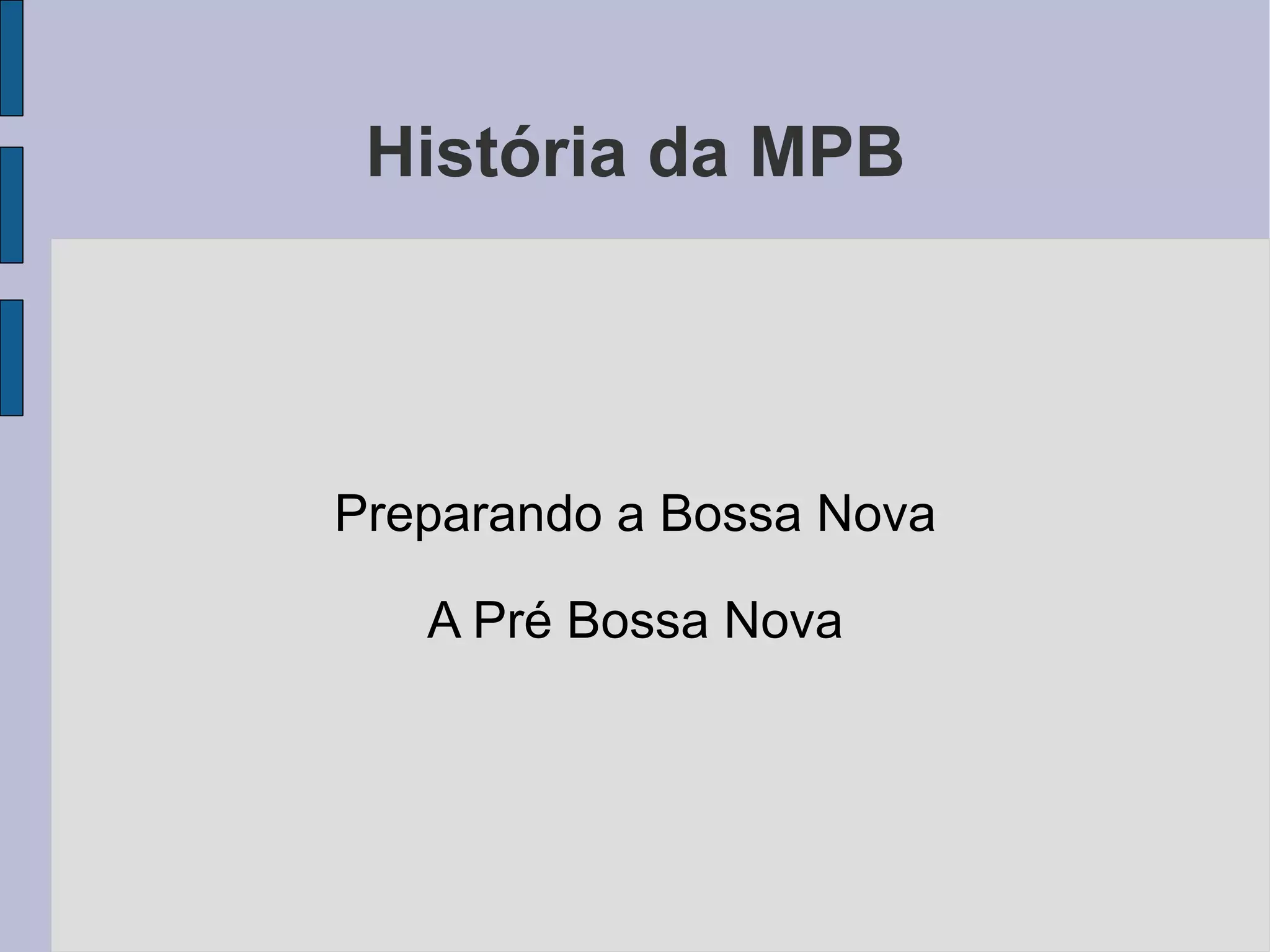 O documento lista os principais cantores, compositores e sucessos musicais do período pré-bossa nova no Brasil, entre 1950-1956, quando artistas como Dick Farney, Lúcio Alves e Tom Jobim começaram a desenvolver o estilo que daria origem à bossa nova.