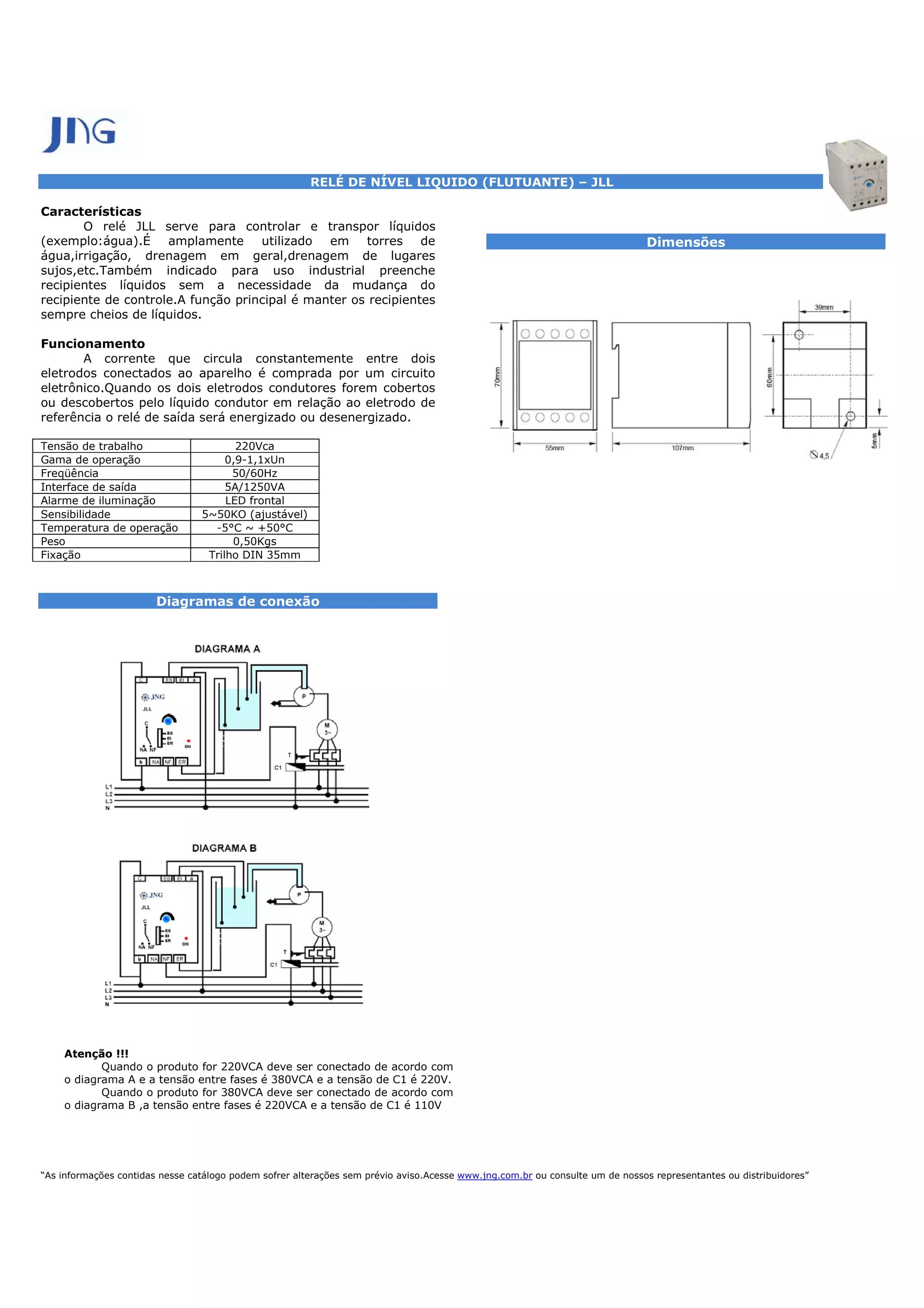 O relé JLL controla e transporta líquidos em torres de água, irrigação e drenagem. Ele mantém recipientes sempre cheios de líquidos detectando quando dois eletrodos estão cobertos ou descobertos pelo líquido condutor. Pode operar com tensão de 220VCA ou 380VCA e tem alcance de 0,9-1,1xUn, interface de saída de 5A/1250VA e temperatura de operação de -5°C a +50°C.