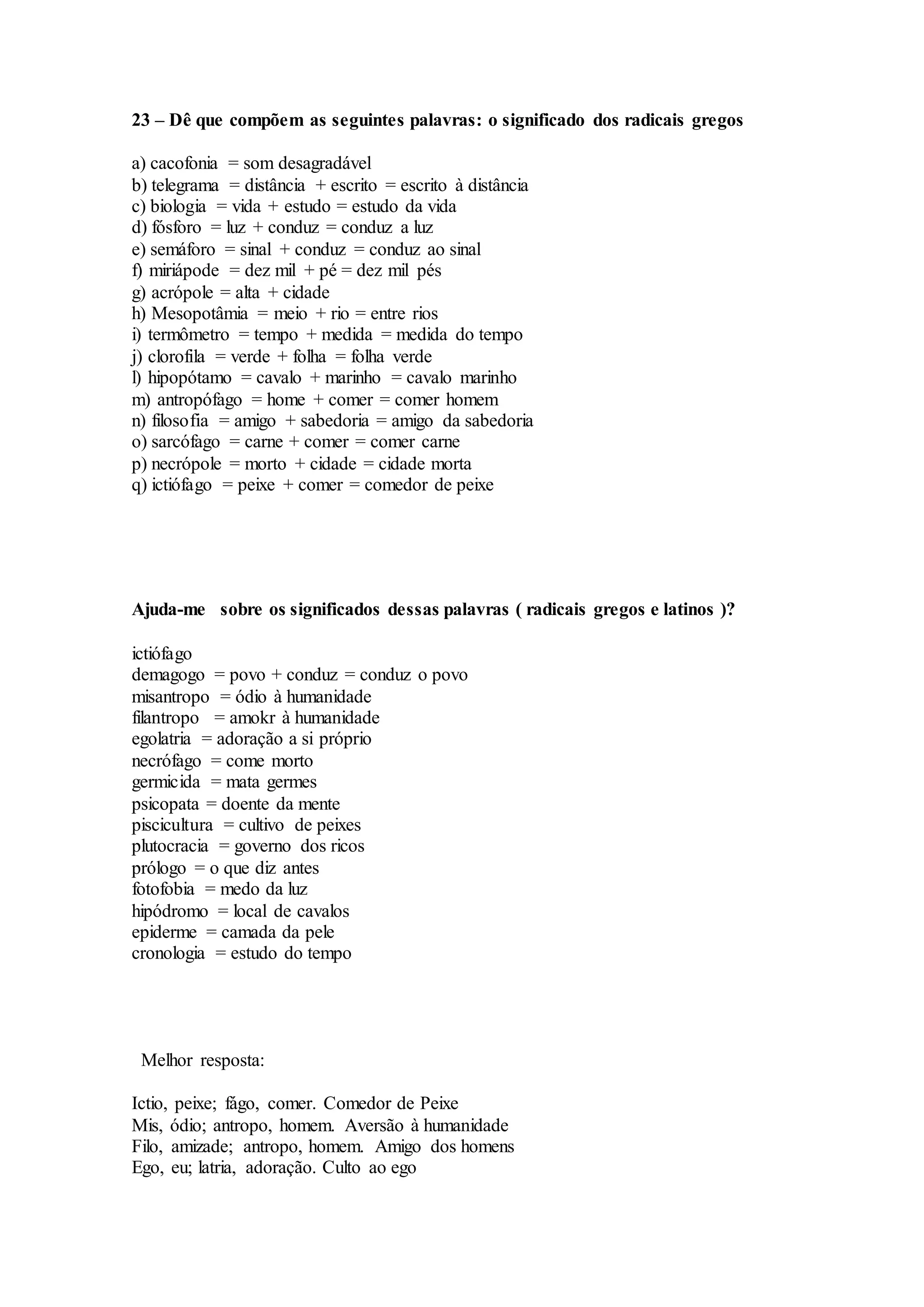O documento lista várias palavras gregas e latinas e seus significados. As palavras são decompostas em seus radicais e explica-se o significado de cada um. Por exemplo, ictiófago significa "comedor de peixes", onde ictio significa peixe e fágo significa comer.