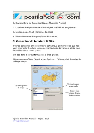 2) Também aborda tópicos como customização da interface, criação e manipulação de projetos no Vault, derivação de peças para macho e cavidade,
