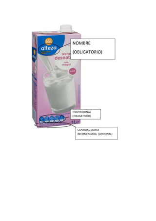 Este documento fornece informações nutricionais sobre vários itens, incluindo seus nomes, tipos nutricionais obrigatórios e, opcionalmente, quantidades diárias recomendadas. Os dados são apresentados em uma tabela simples com colunas para nome, tipo nutricional e quantidade diária.