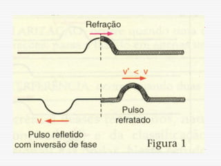 O documento descreve os principais conceitos sobre ondas, incluindo sua classificação em mecânicas e eletromagnéticas, características como amplitude, frequência e comprimento de onda. Também aborda fenômenos como interferência, difração e polarização de ondas. Destaca o desenvolvimento de um equipamento japonês capaz de escrever letras na água através da interferência construtiva de ondas.