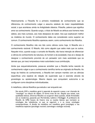 O documento discute a relação entre conhecimento filosófico e científico. Inicialmente, o conhecimento filosófico englobava todo o saber racional na Grécia Antiga, sem distinção entre filosofia e ciência. Posteriormente, o conhecimento se dividiu em filosófico, sobre generalidades, e científico, sobre particulares. Atualmente, embora distintos, filosofia e ciência permanecem em interação, com a filosofia da ciência integrando ambos.