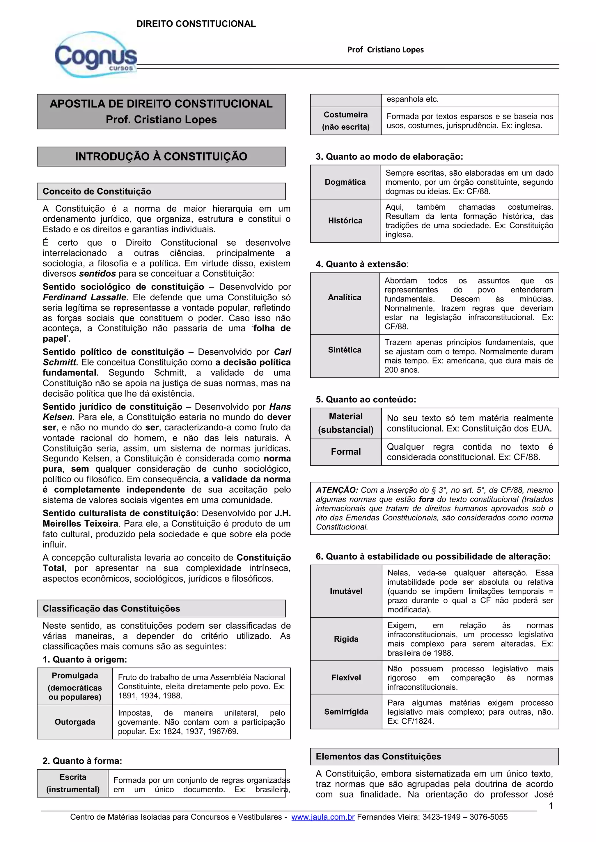 O documento classifica e descreve diferentes tipos de constituições, abordando sua origem, forma, elaboração, extensão, conteúdo, estabilidade e elementos. Fala sobre constituições escritas e costumeiras, promulgadas e outorgadas, analíticas e sintéticas, materiais e formais, entre outros aspectos.