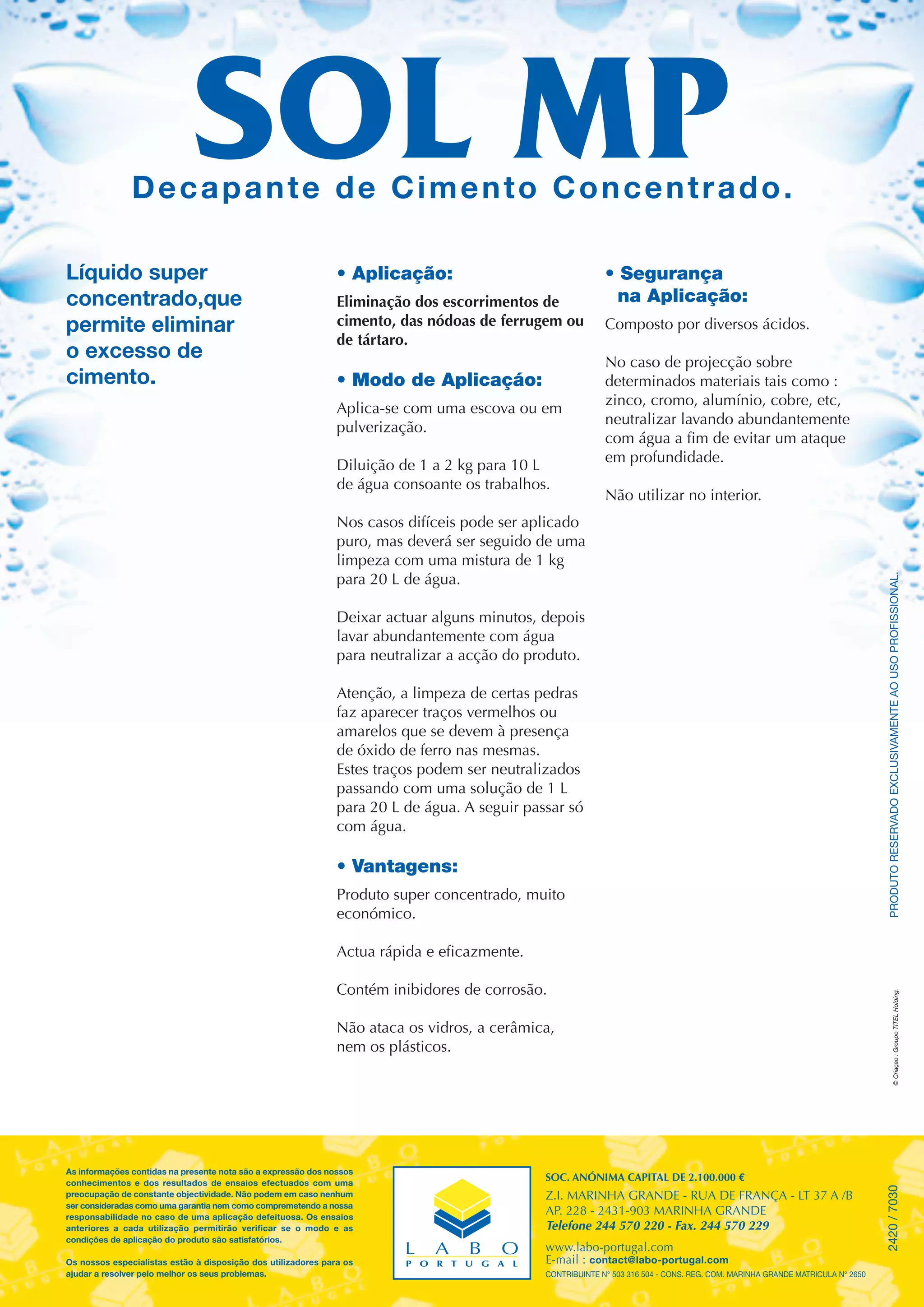 Este documento descreve um decapante de cimento concentrado para remover excesso de cimento, nódoas de ferrugem ou tártaro. Ele deve ser aplicado com uma escova ou pulverizado e deixado agir por alguns minutos antes de lavar com água. O produto é super concentrado e atua rapidamente para remover cimento de forma econômica, sem danificar vidros, cerâmicas ou plásticos.
