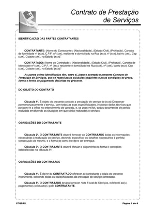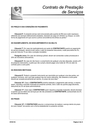 Este contrato define os termos e condições de um acordo de prestação de serviços entre duas partes. Ele especifica os detalhes do serviço, as obrigações de cada parte, os termos de pagamento, penalidades por inadimplemento, condições para rescisão e outras cláusulas gerais.