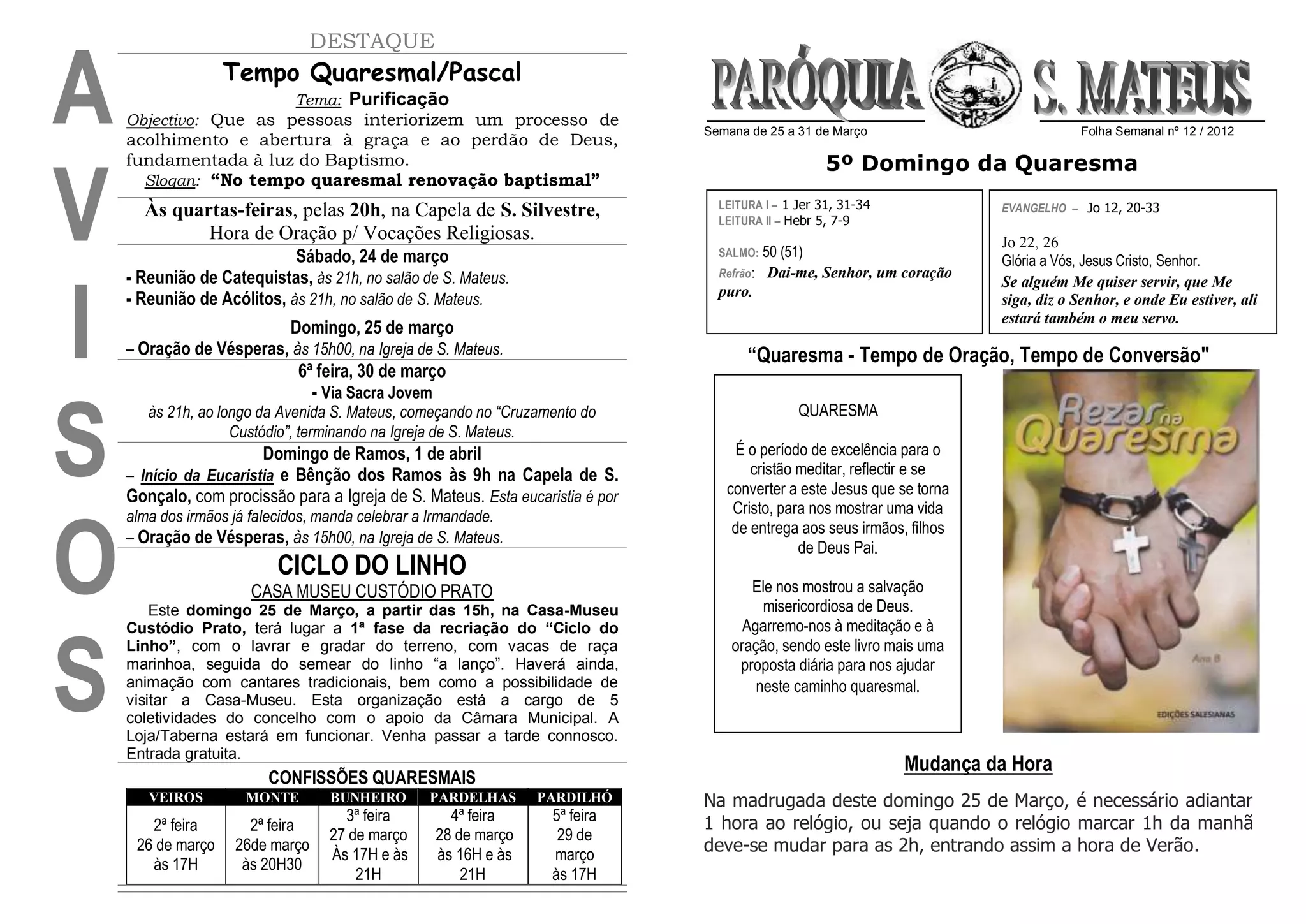 1) O documento descreve eventos e atividades religiosas durante a Quaresma e a Páscoa em uma paróquia, incluindo orações, reuniões, Via Sacra e confissões.