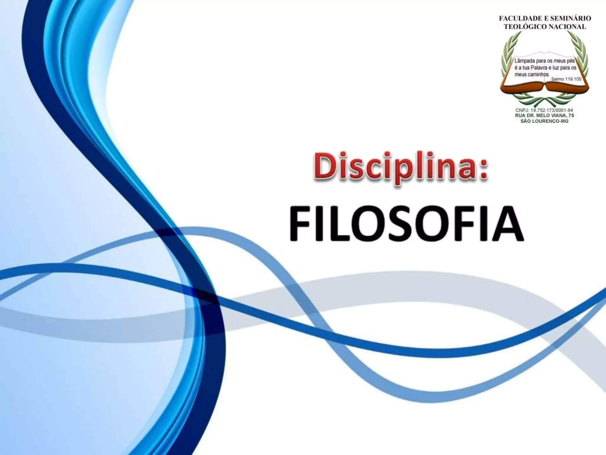 O documento apresenta um resumo sobre a disciplina de Filosofia no Seminário Teológico Nacional. Ele discute a origem e evolução da filosofia desde os pré-socráticos até a filosofia medieval, destacando os principais períodos e pensadores, como Tales de Mileto, Sócrates, Platão, Aristóteles, Santo Agostinho e Santo Tomás de Aquino.