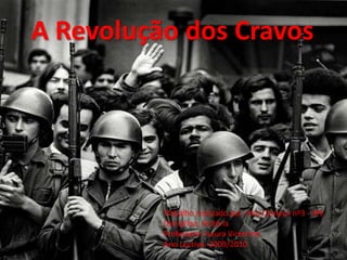 O documento descreve a Revolução dos Cravos de 25 de Abril de 1974 em Portugal, que pôs fim à ditadura de Salazar e Caetano sem violência. Detalha o período anterior à revolução sob o regime autoritário do Estado Novo e as condições difíceis no país. Resume os eventos chave da revolução, incluindo a transmissão de músicas pela rádio que marcaram o início do golpe, e a rendição de Caetano após a ocupação do Terreiro do Paço e do Quartel do Carmo.
