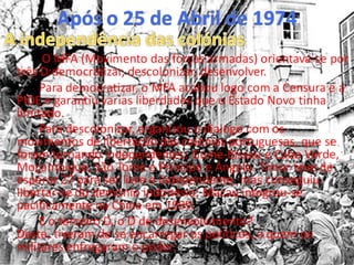 O documento descreve a Revolução dos Cravos de 25 de Abril de 1974 em Portugal, quando um golpe militar derrubou o regime autoritário de Estado Novo que governou Portugal por 48 anos. O povo português ofereceu flores aos militares em sinal de paz em vez de violência. Isto levou à revolução ser conhecida como a "Revolução dos Cravos". A revolução resultou na queda do governo de Marcelo Caetano e no estabelecimento de um governo provisório militar que começou a transição de Portugal para a dem