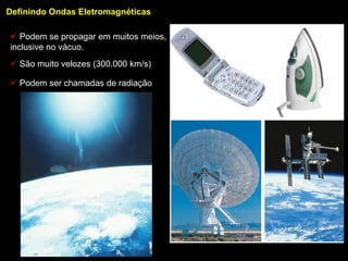 As ondas eletromagnéticas podem se propagar em vários meios, inclusive no vácuo, a velocidades extremamente altas de 300.000 km/s. Estas ondas formam o espectro eletromagnético e quanto maior a frequência, maior a energia transportada. O documento descreve as diferentes radiações do espectro eletromagnético, incluindo seus comprimentos de onda, frequências, aplicações e curiosidades.