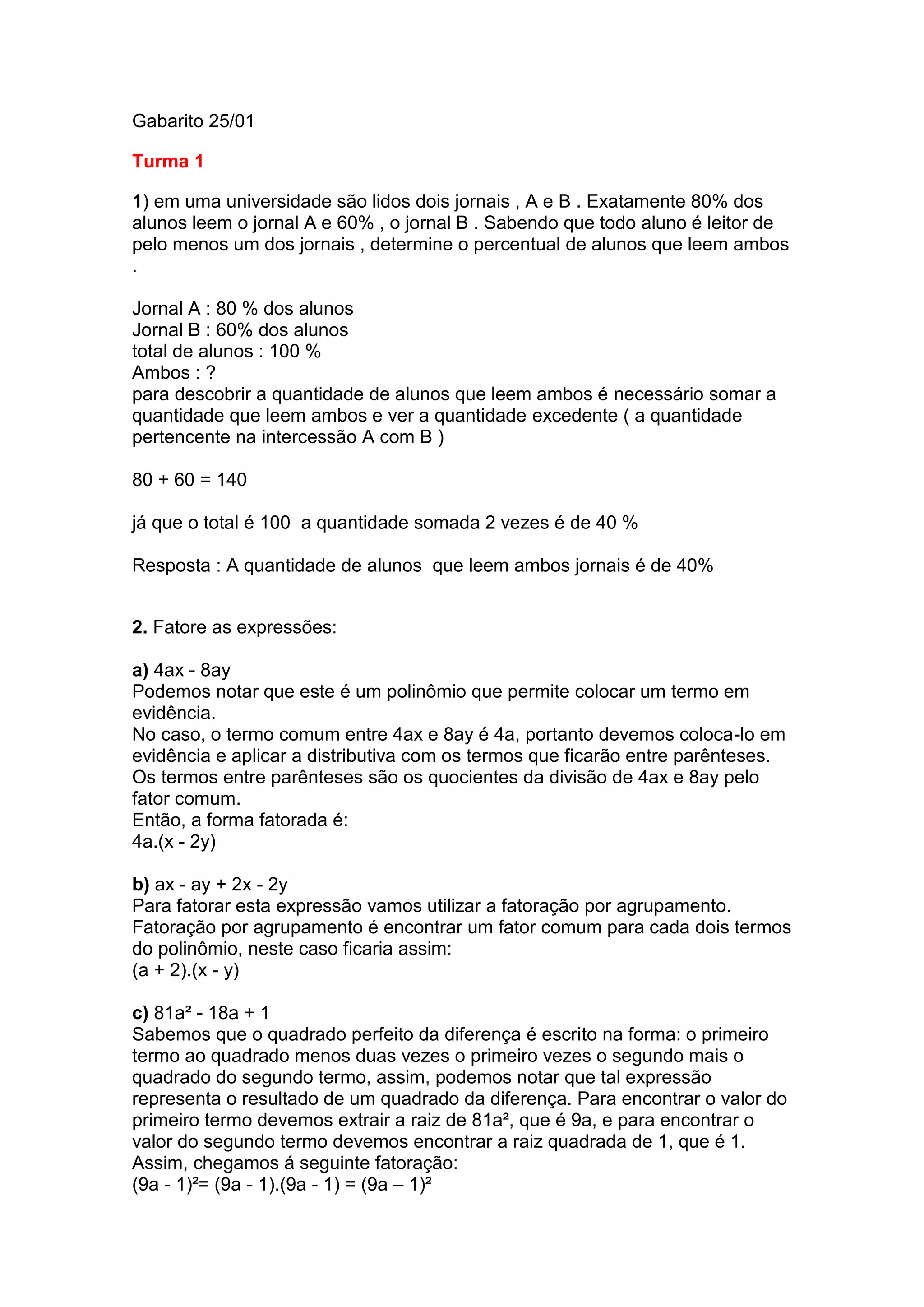 O documento apresenta três questões sobre estatística de leitores de jornais em uma universidade. A primeira pergunta pede para determinar o percentual de alunos que leem ambos os jornais A e B, sabendo que 80% leem A e 60% leem B. A segunda questão pede para fatorar expressões algébricas. A terceira questão apresenta um problema sobre consumo de água na produção de papel.