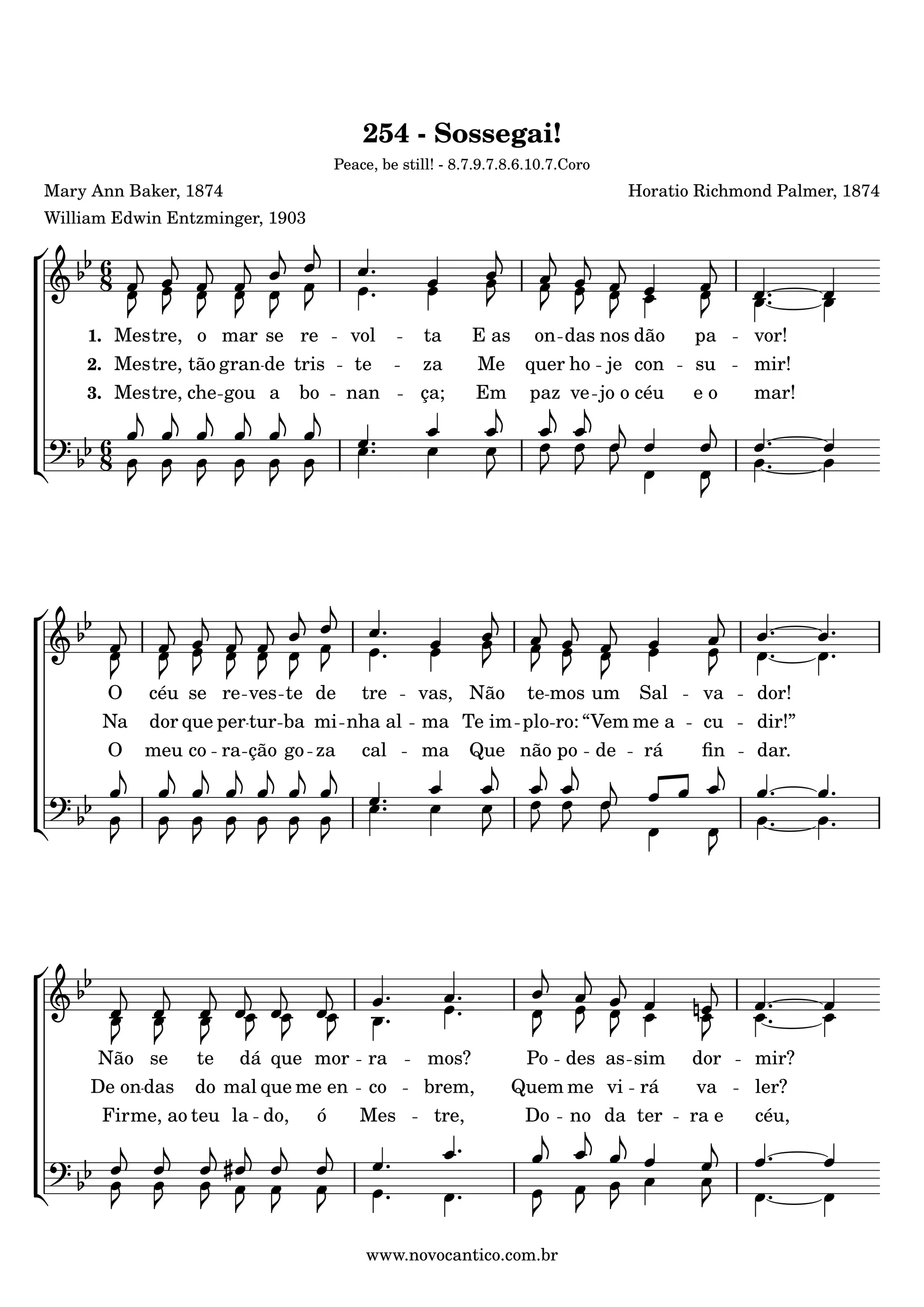 O documento é uma música religiosa em português dividida em três partes. A primeira parte fala sobre o mestre pedindo paz ao mar revolto e conforto em sua tristeza. A segunda parte descreve o céu se vestindo de trevas e implorando ao Salvador por conforto. A terceira parte pede ao mestre para ficar ao seu lado para protegê-lo das águas e do mal, confiando que o Senhor os salvará. A música termina repetindo o pedido de paz e confiança no mestre.