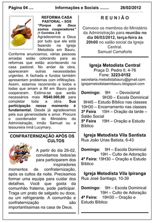 A Igreja Metodista em Bauru está realizando reformas na casa pastoral e precisa de mais R$40.000,00 em doações. Uma reunião da administração foi convocada para o dia 06/03/2012 às 20h00. A partir de 26/02, os membros são convidados para momentos de confraternização após os cultos.
