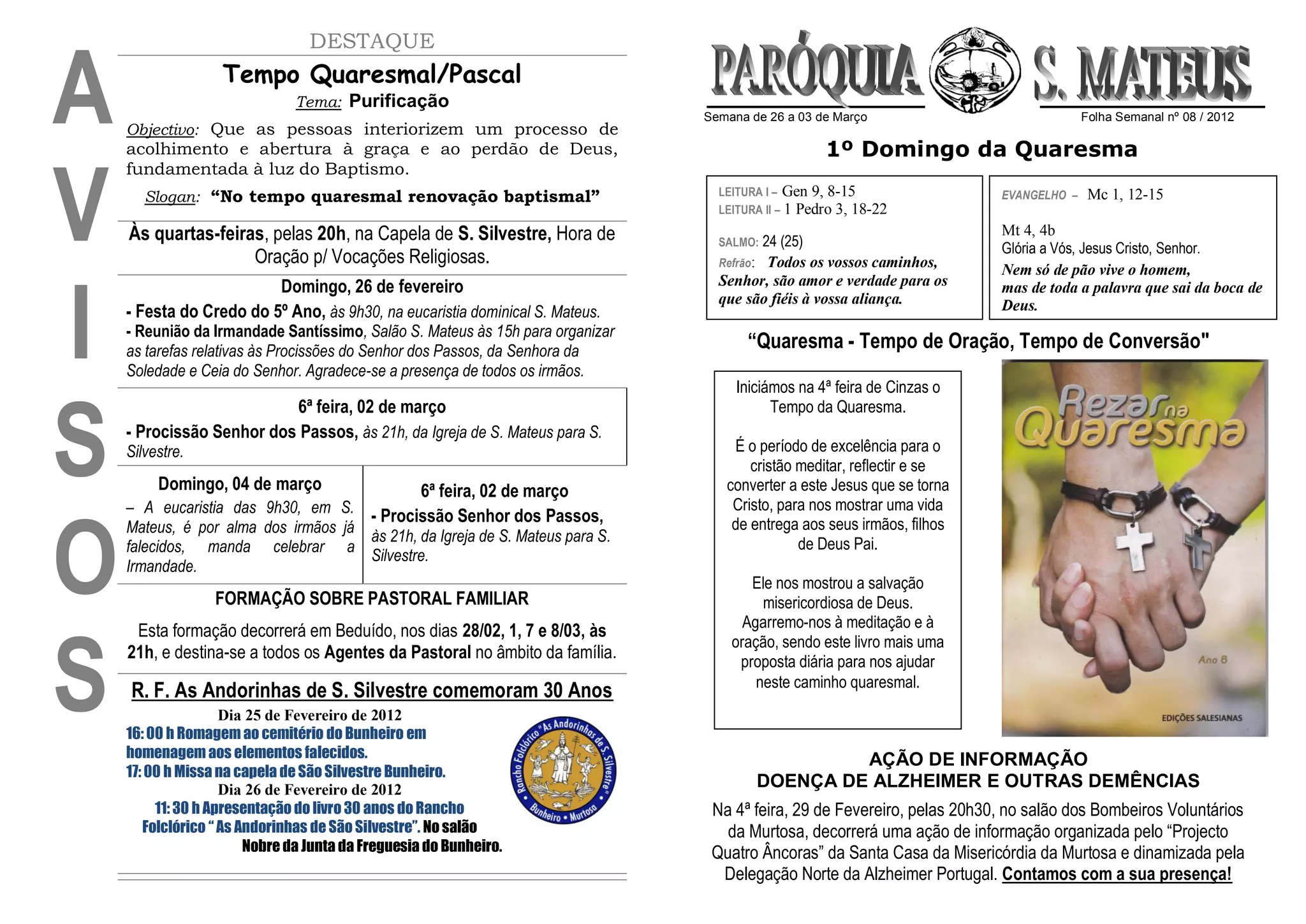 [1] O documento descreve eventos e atividades durante a Quaresma e Páscoa na paróquia, incluindo procissões e missas. [2] Ele enfatiza que a Quaresma é um tempo para oração, reflexão e conversão para seguir o exemplo de Jesus. [3] Também anuncia eventos como uma formação sobre pastoral familiar e uma ação de informação sobre a doença de Alzheimer.