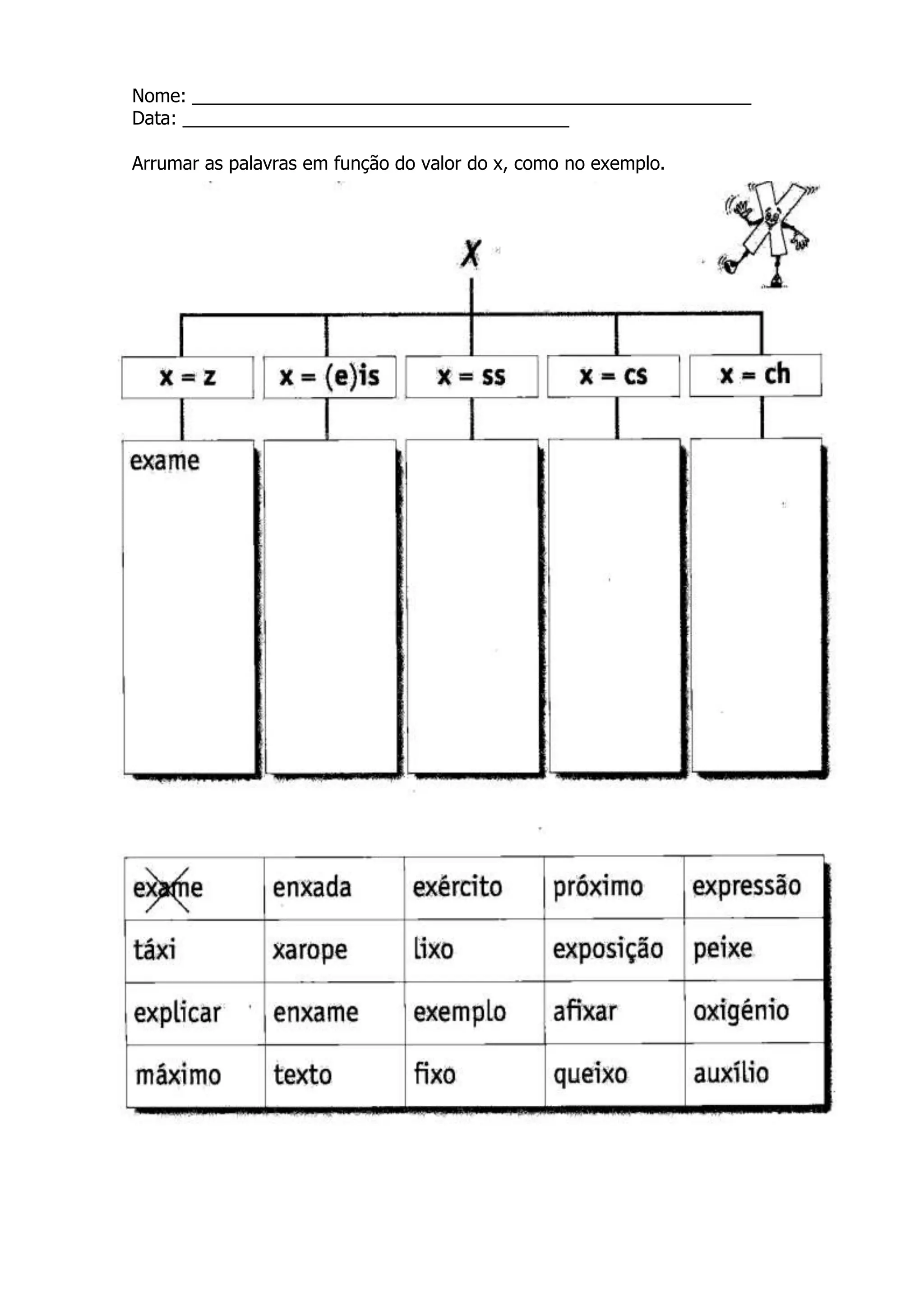 Este documento pede para organizar palavras de acordo com o valor de x, como em um exemplo anterior.