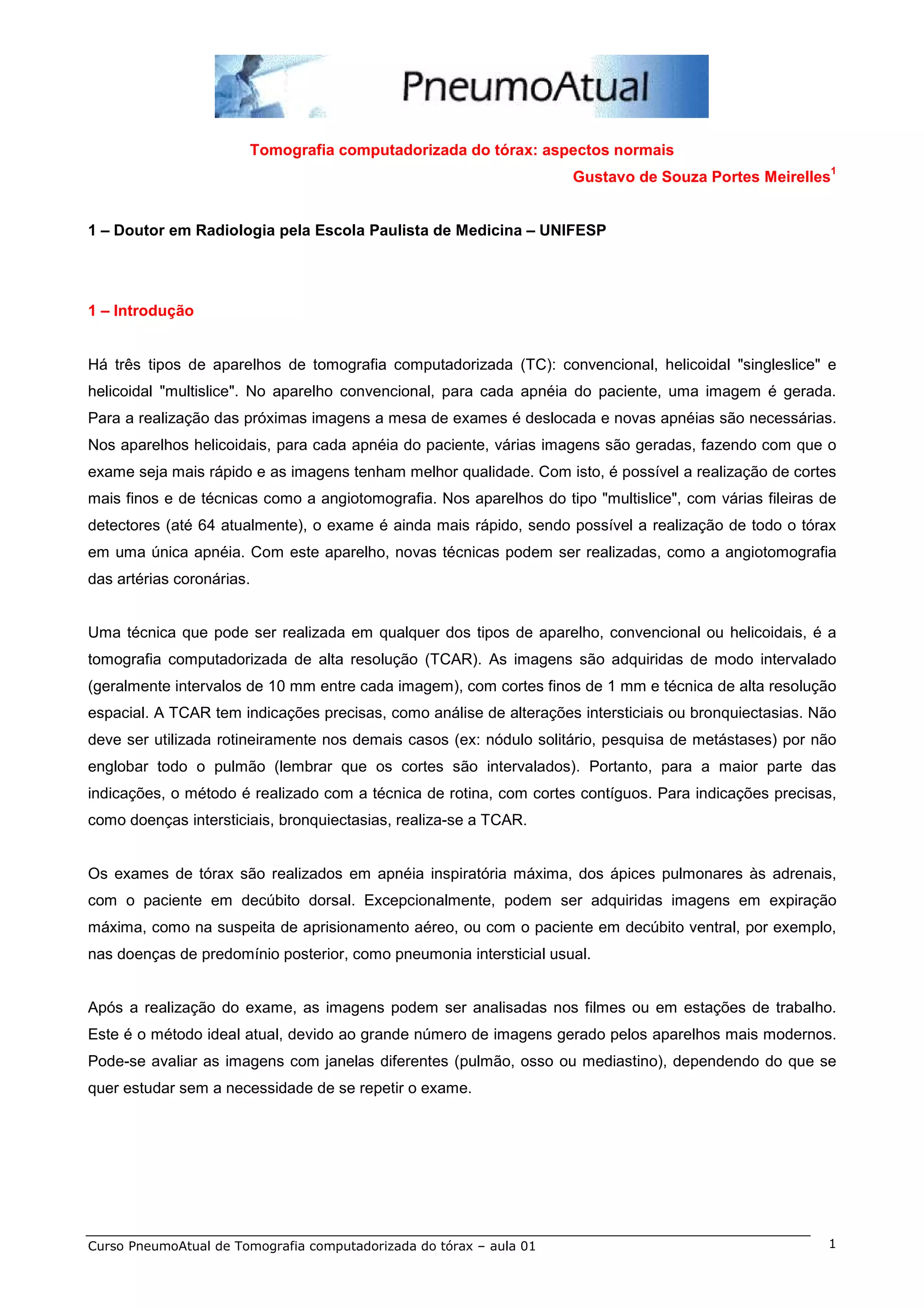 Este documento descreve os aspectos normais da tomografia computadorizada do tórax, incluindo as principais estruturas anatômicas, técnicas de imagem e posições do paciente. Explica os diferentes tipos de aparelhos de TC, a anatomia normal visualizada e técnicas especiais como a angiotomografia e a tomografia computadorizada de alta resolução.