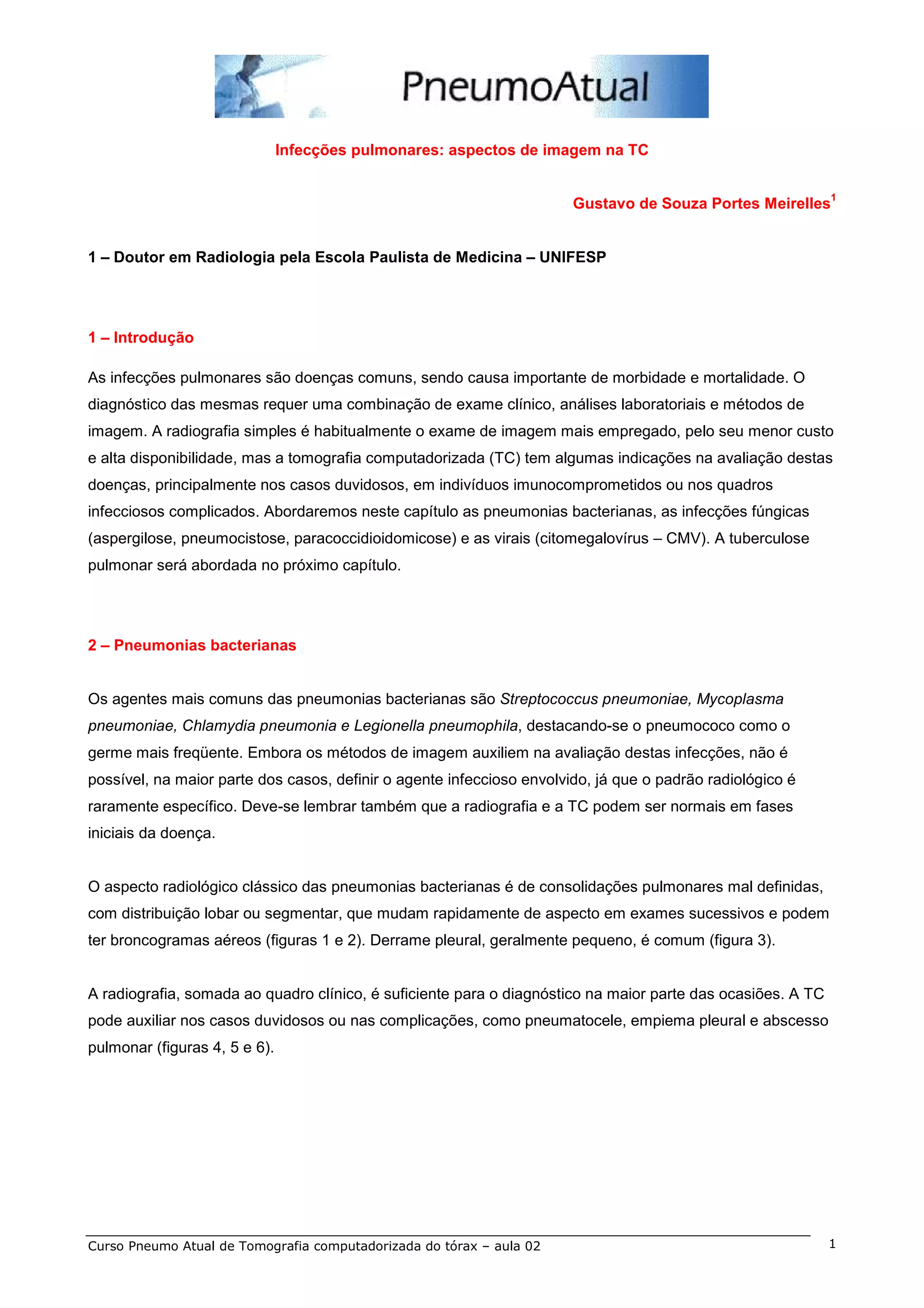 Este documento discute os aspectos de imagem por tomografia computadorizada (TC) de várias infecções pulmonares, incluindo pneumonias bacterianas, infecções fúngicas como aspergilose e pneumocistose, e infecções virais como citomegalovírus. Detalha os achados típicos da TC para cada tipo de infecção, ilustrando com diversas imagens, e ressalta a importância da TC para o diagnóstico e avaliação de complicações destas doenças.