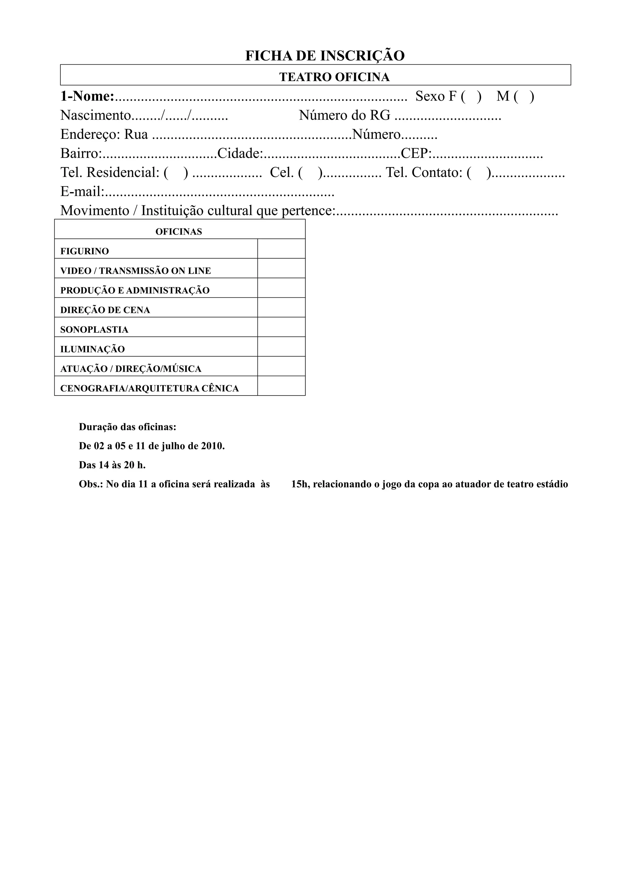 Este documento é uma ficha de inscrição para oficinas no Teatro Oficina. Ele solicita informações pessoais como nome, sexo, data de nascimento, endereço e contato, além de perguntar sobre afiliação a movimentos culturais. Também lista as oficinas disponíveis e fornece detalhes sobre suas datas e horários.