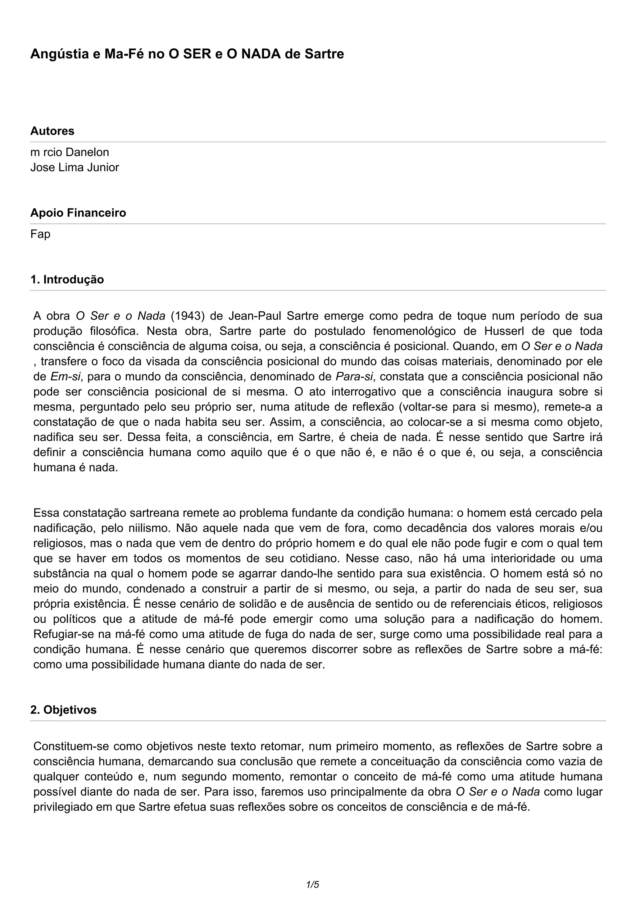 O documento discute a angústia e má-fé na obra Ser e Tempo de Sartre. Sartre argumenta que a consciência humana é vazia e nada, levando à angústia existencial. Para escapar disso, os humanos podem adotar a má-fé, enganando a si mesmos para acreditar que possuem uma essência que guia suas ações.