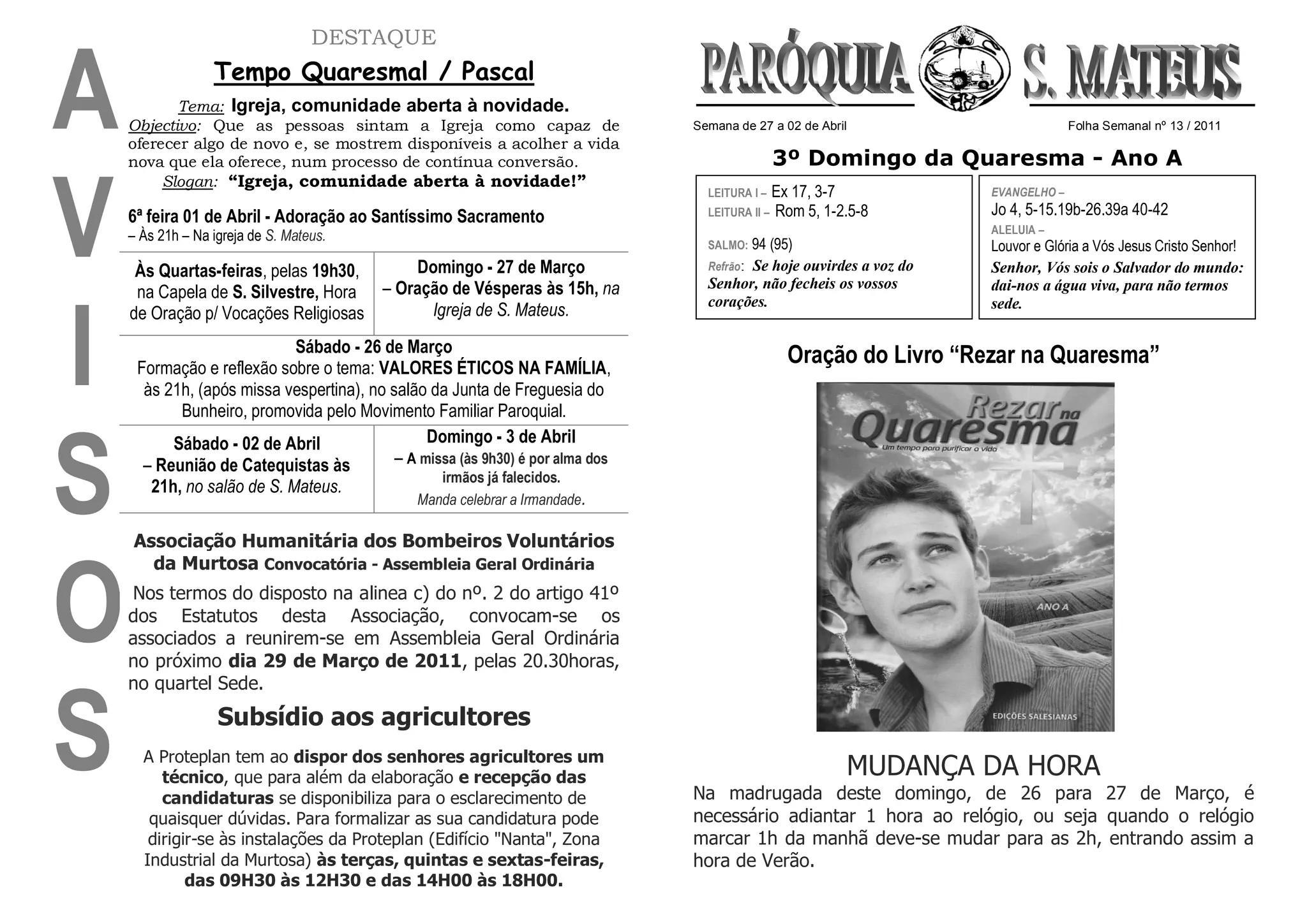Este documento resume os eventos e serviços religiosos de uma igreja nas próximas semanas, incluindo missas, adoração ao Santíssimo Sacramento, reuniões de catequistas, e orações. Também anuncia uma palestra sobre valores éticos na família e informa sobre a mudança do horário no domingo seguinte.