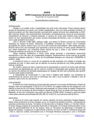 Este documento apresenta a Caverna do Urubu localizada em Riachuelo, Sergipe. A caverna possui uma rica biodiversidade de invertebrados associados ao guano de morcegos, porém está sofrendo degradação devido a ações humanas como desmatamento e lixo. O trabalho objetiva conscientizar sobre a importância de se preservar este ambiente frágil e seus habitantes ainda pouco estudados.