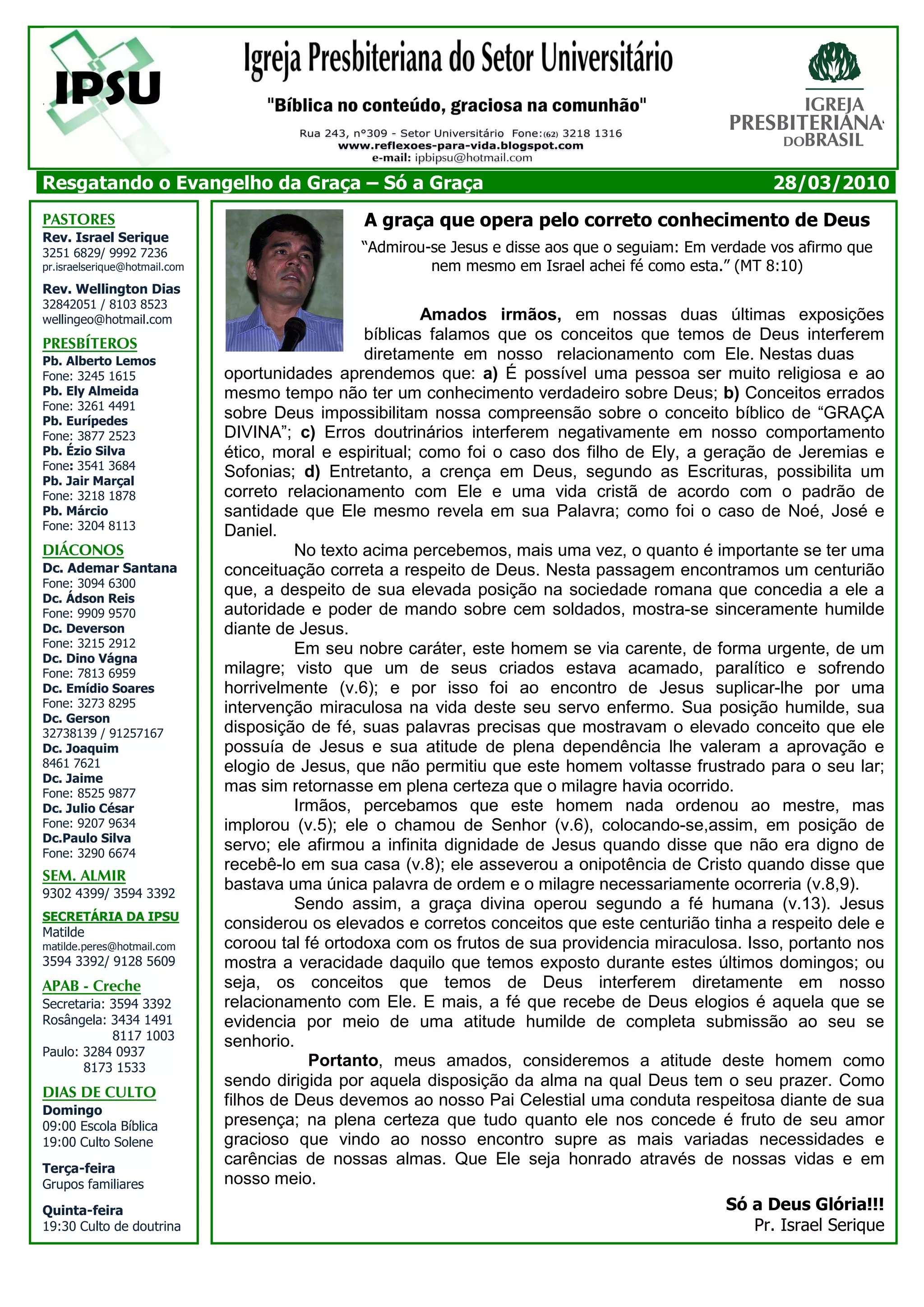 Este documento discute a importância de ter uma concepção correta de Deus e como isso afeta nossa fé e relacionamento com Ele. Ele usa o exemplo de um centurião romano que demonstrou grande fé em Jesus ao pedir que curasse seu servo enfermo. Sua humildade e confiança em Jesus agradaram a Ele, que elogiou sua fé e cumpriu o pedido do centurião. Isso mostra como uma visão correta de Deus permite uma relação próxima com Ele e receber Sua graça.
