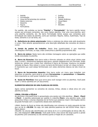 1) O documento fornece uma introdução básica ao software Microsoft Excel, incluindo seus principais elementos e conceitos como planilhas, células, linhas e colunas. 2) É explicado como abrir o Excel e navegar por sua interface, com detalhes sobre menus, barras de ferramentas e elementos da tela. 3) São definidos conceitos-chave como célula ativa, endereço de célula, intervalo de células e como inserir dados em células.